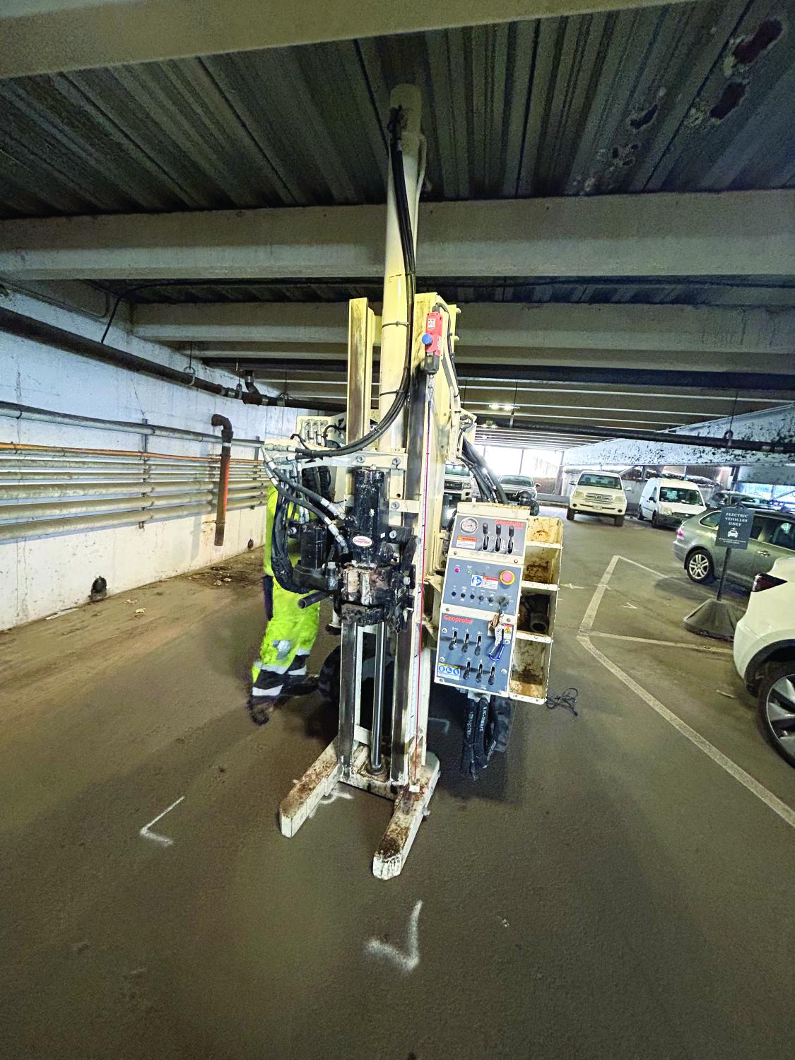 The drillers used a combination of traditional 5-foot Macro-Core® sleeves for drilling soil samples in narrow areas around the lab as well as short 2-foot tooling that allowed them to operate inside the adjacent parking garage, which had just 9 feet of overhead clearance.