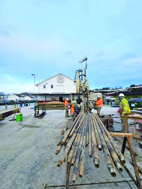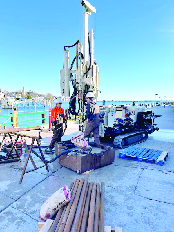 7822DT small drill rig sets 4.25 hollow stem augers off the end of a dock on Mackinac Island. They performed mud rotary out the end and pulled the rods before taking a split spoon sample. In search of bedrock, they sampled every 5 feet.