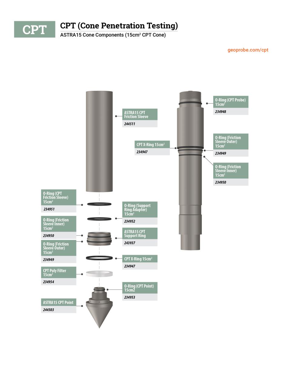 Geoprobe® manufactures ASTRA CPT cones in both 10 cm² and larger 15 cm² sizes. The 15 cm² cone, with its 44 mm (1.73 in) diameter, offers several advantages depending on soil type: